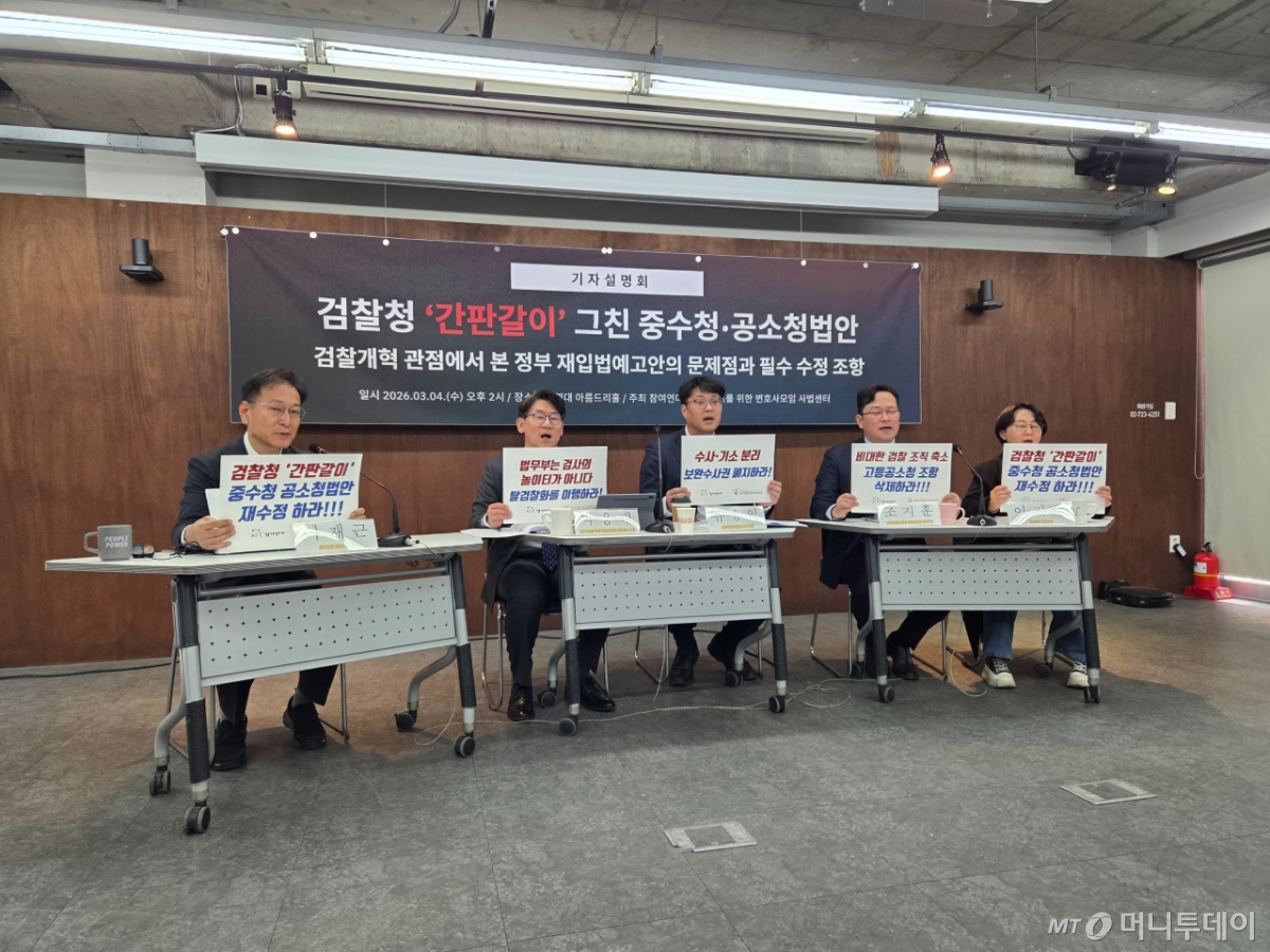 참여연대와 민주사회를 위한 변호사모임(민변) 사법센터는 4일 오후 서울 종로구 참여연대 아름드리홀에서 '검찰청 '간판갈이' 그친 중수청·공소청 법안 기자설명회'를 열었다. 이들은 두 법안이 '수사와 기소의 조직적 분리'라는 검찰개혁의 취지와 배치된다며 법안 수정을 요구했다.
