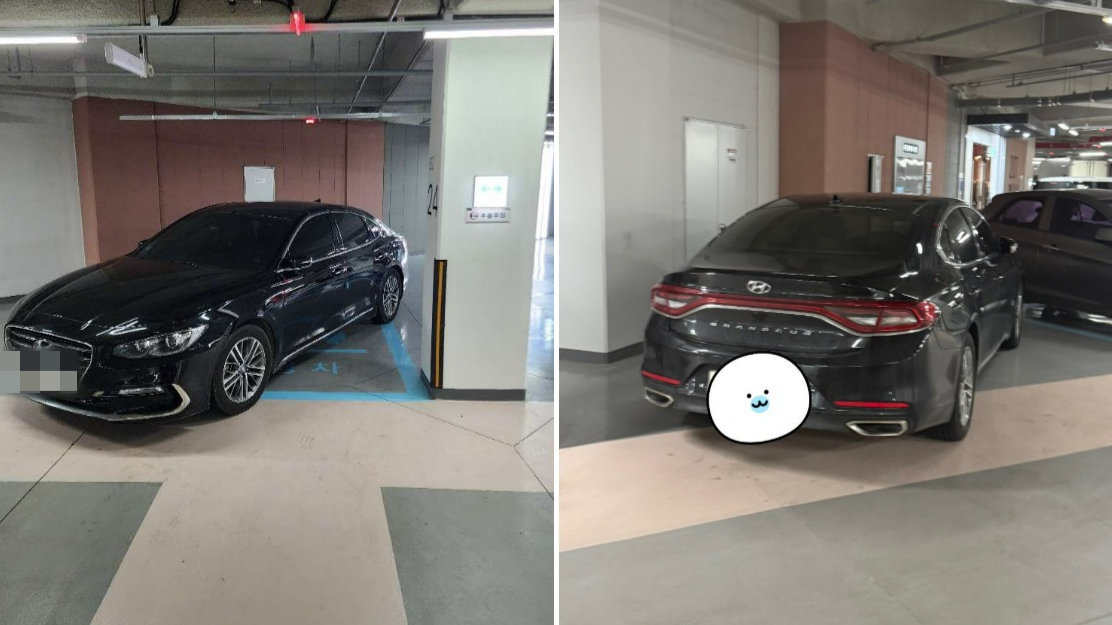 해당 글에는 한 누리꾼으로부터 제보받은 사진 여러 장이 첨부돼 있었다. 사진에는 검은색 그랜저 차량이 아파트 지하 주차장 곳곳에 민폐 주차해 놓은 모습이 담겼다.