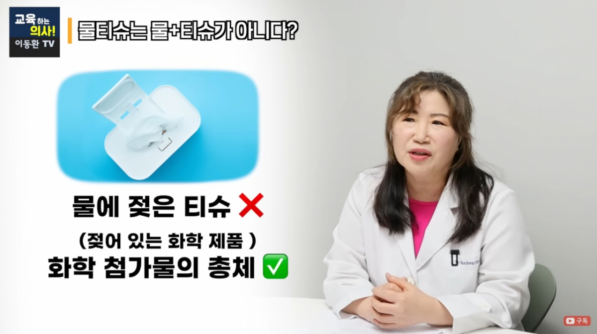 최은정 이화여대 과학교육학 박사는 최근 한 유튜브 채널에 나와 "물티슈를 물에 적신 티슈, 휴지라고 많이들 생각하는데 물티슈는 젖어있는 화학 제품이다. 화학 첨가물의 총체"라고 주장했다.