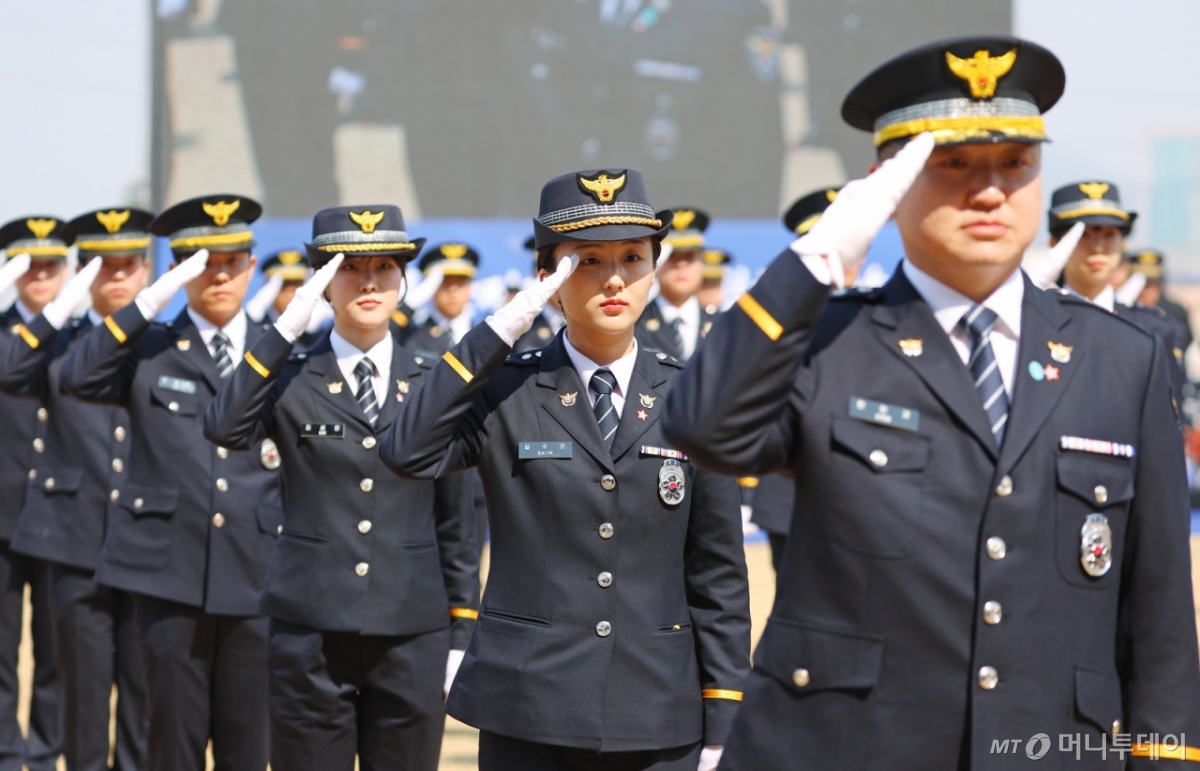 ![[아산=뉴시스] 고범준 기자 = 17일 충남 아산시 경찰대학에서 열린 2026년 신임 경찰 경위·경감 임용식에서 신임 경찰이 이재명 대통령을 향해 경례하고 있다. 2026.03.17. bjko@newsis.com /사진=](https://thumb.mt.co.kr/cdn-cgi/image/f=avif/21/2026/03/2026031712340229289_1.jpg)