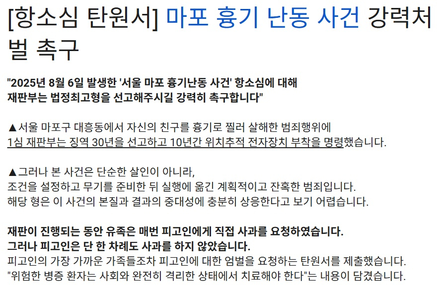 A씨는 항소심 재판을 앞두고 엄벌 탄원서를 모으고 있다. 그는 "억울하게 세상을 떠난 동생 사건이 가볍게 지나가지 않도록 힘을 보태달라"며 "재판부는 피고인을 사회로부터 영구히 격리할 수 있는 법정 최고형을 선고해달라"고 촉구했다.