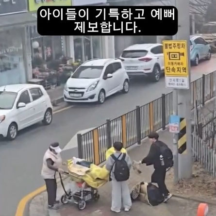 제보자는 "구미 형곡동 한 초등학교 앞에서 두 명의 학생이 재활용 수집 할머니를 도와주고 있더라"며 "할머니를 도우며 100m 넘는 거리를 함께 걷던 아이들 모습이 기특하고 예뻐 제보한다"고 밝혔다.