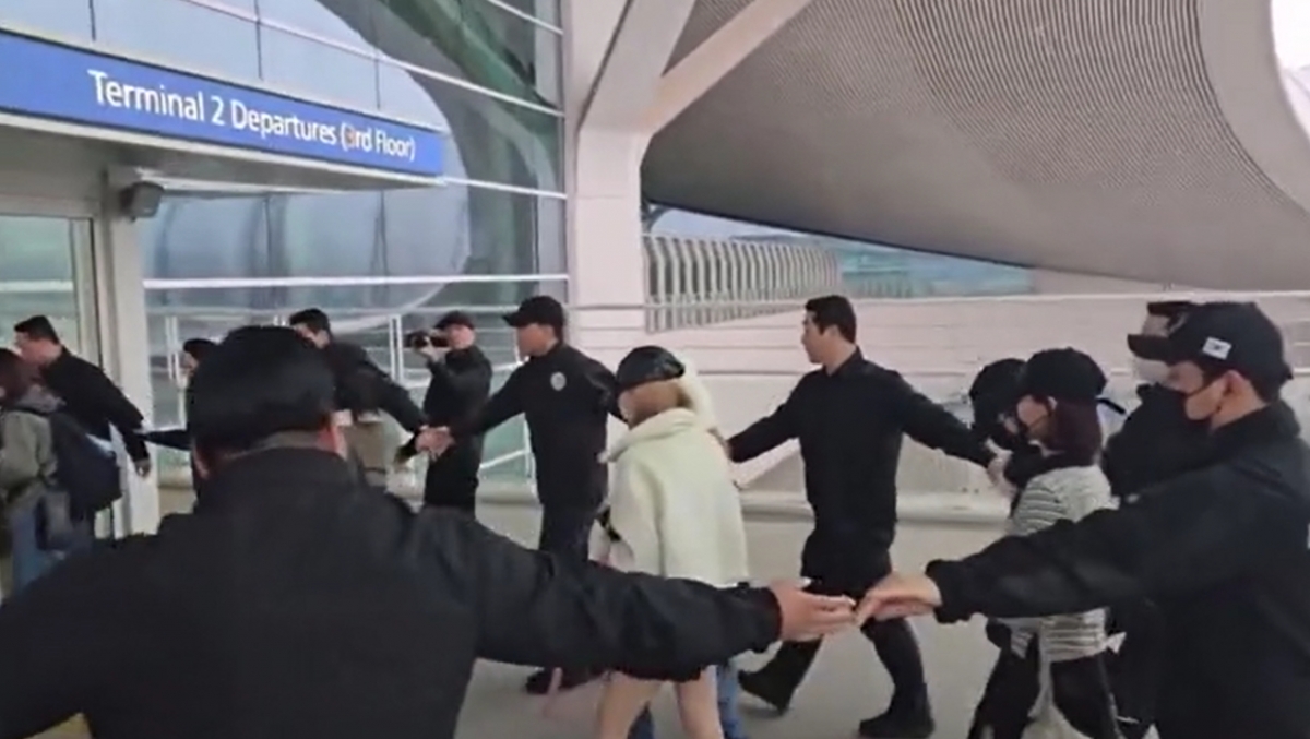 하츠투하츠는 18일 오전 미국 출국을 위해 인천공항을 찾았다. SNS(소셜미디어)에 확산한 영상을 보면 이들은 차에서 내려 공항으로 걸어가는 동안 '강강술래' 경호를 받았다. 경호원 10여명이 손을 잡고 하츠투하츠를 넓게 에워싼 채 이동했다.