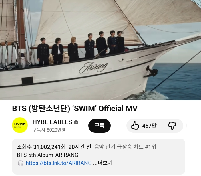 21일 오전 현재 전날 오후 1시 유튜브에서 공개된 방탄소년단 정규 5집 '아리랑'(ARIRANG) 타이틀곡 '스윔'(SWIM)의 뮤직비디오는 약 1시간50분 만에 조회수 1000만회, 20시간 만에 3100만회를 돌파하며 폭발적인 인기를 보이고 있다.