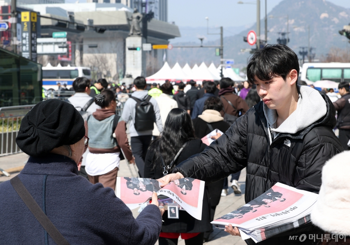 21일 서울 광화문 일대에서 방탄소년단(BTS) 컴백 공연을 기다리는 팬들이 '머니투데이 with BTS' 호외를 받고 있다.