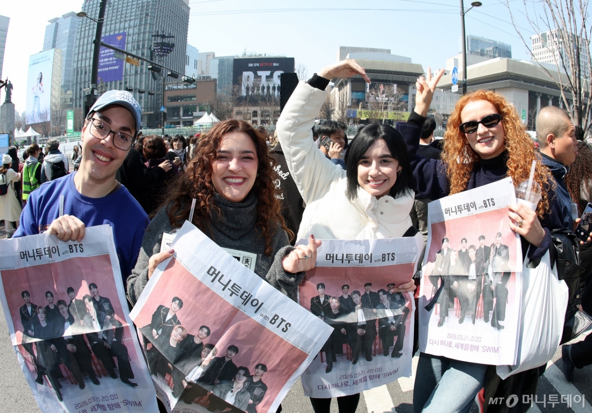 21일 서울 광화문 일대에서 방탄소년단(BTS) 컴백 공연을 기다리는 외국인 팬들이 '머니투데이 with BTS' 호외를 들고 기뻐하고 있다. 독자들의 PICK! '외도' 아내, 25층 매달려 협박…남편, 결국 상간남 만남 허락 "확 달라진 얼굴"...김지민 퉁퉁 붓고 멍 잔뜩 '깜짝', 무슨일? 김정태, 중학생 자녀와 '동반 샤워' 집착…"발가벗긴 뒤 로션까지" "임신하자 소속사에서 낙태 강요, 폭언도"...유명 작곡가 폭로