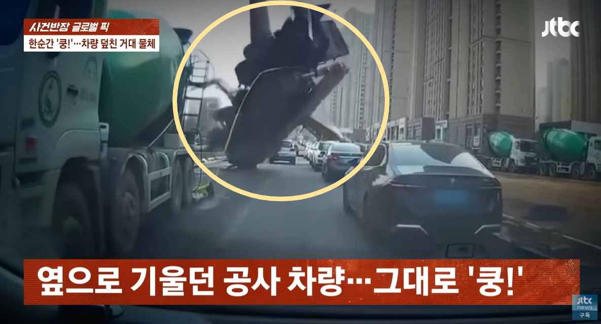 중국에서 거대한 공사 차량이 도로 위로 쓰러지는 아찔한 사고가 발생했다.