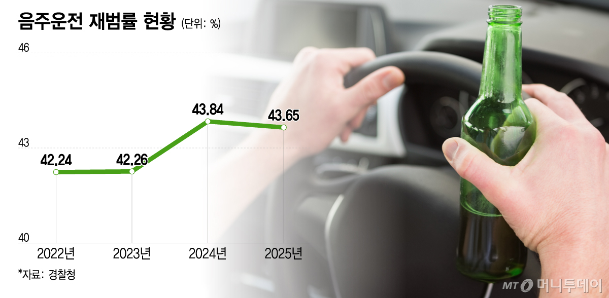 25일 경찰청에 따르면 지난해 음주운전 재범률은 43.65%로 집계됐다. 전년보다는 소폭 하락했지만 △2022년 42.24% △2023년 42.26% △2024년 43.84% 등으로 추세적인 상승 흐름이다.