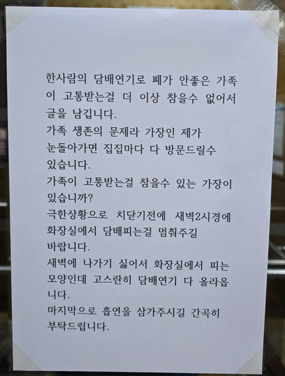 새벽 시간 아파트 화장실에서 담배를 피우지 말아 달라는 호소문이 등장해 눈길을 끌고 있다.