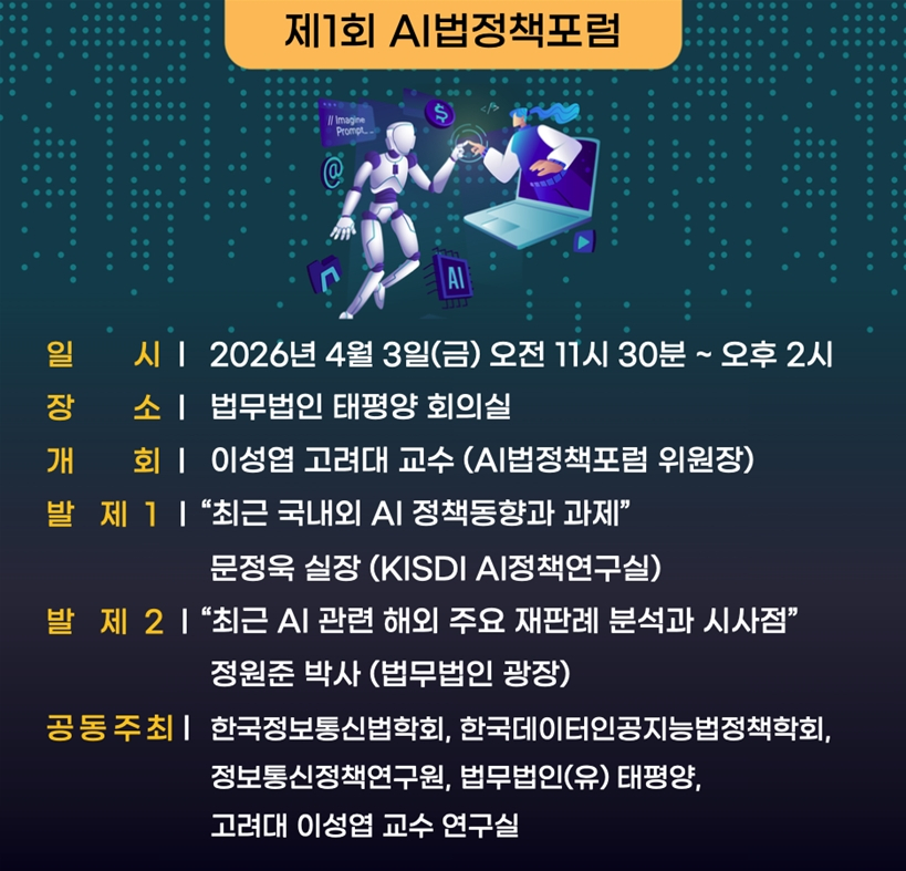 이번 세미나에는 정보통신정책연구원 문정욱 AI정책실장이 '국내외 AI정책동향과 과제'에 대해 발표할 예정이며, 광장 정원준 박사는 'AI 관련 해외 주요 재판례 분석과 시사점'에 대해 설명할 예정이다. 이후에는 AI 법정책 포럼 소속 전문가들이 패널토론과 질의응답을 진행한다. AI 법정책 포럼은 AI 분야 법률, 정책 전문가 20여 명으로 구성됐다.