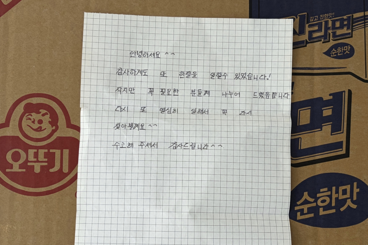 손으로 작성한 편지도 함께 있었는데, "감사하게도 또 한 달을 일할 수 있었다. 작지만 꼭 필요한 분들께 나눠 드렸으면 한다. 다시 또 열심히 일해서 찾아뵙겠다"는 내용이었다.