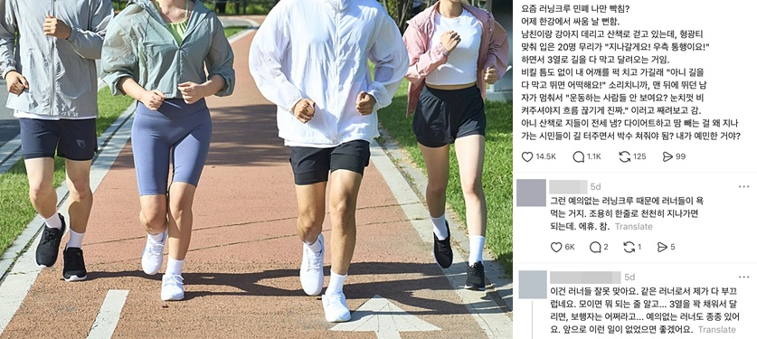 누리꾼들은 "비키라고 소리 지르는 거 불쾌하다", "조용히 한 줄로 달리는 게 최소한의 매너", "보행로에서 3열로 달리면 다른 사람들은 어쩌라는 건지", "무리 지어 뛰어야 하는 이유는 뭐냐", "아이들한테는 욕까지 하더라", "개인 취미를 위해 남한테 피해 주는 행위는 막아야 한다" 등 반응을 보였다.