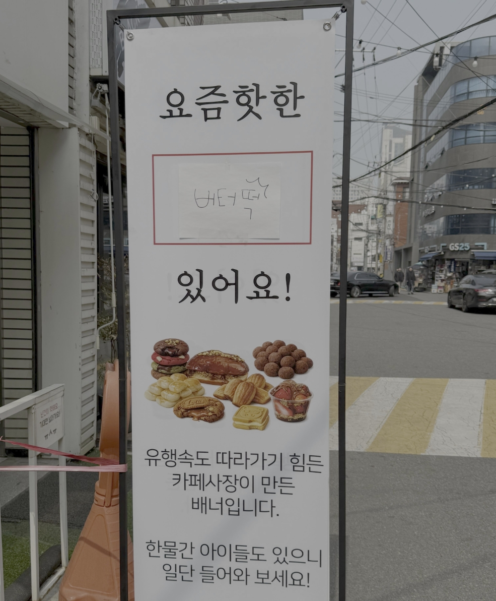 해당 입간판에는 '요즘 핫한'이라는 문구 바로 아래 붉은색 테두리의 빈칸이 마련돼 있고 그 안에는 '버터떡'이라는 메뉴 이름이 투박한 손글씨로 적힌 종이가 덧붙여져 있었다.