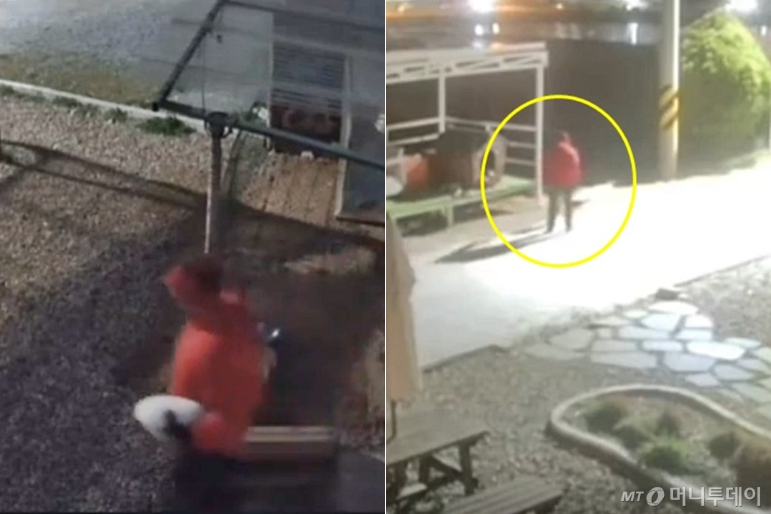 지난 2일 촬영된 CCTV 영상에는 붉은색 점퍼를 입은 남성이 카페 마당에 있는 울타리를 넘어 들어간 뒤 강아지 2마리를 연달아 바닥에 내던지는 모습이 담겼다.