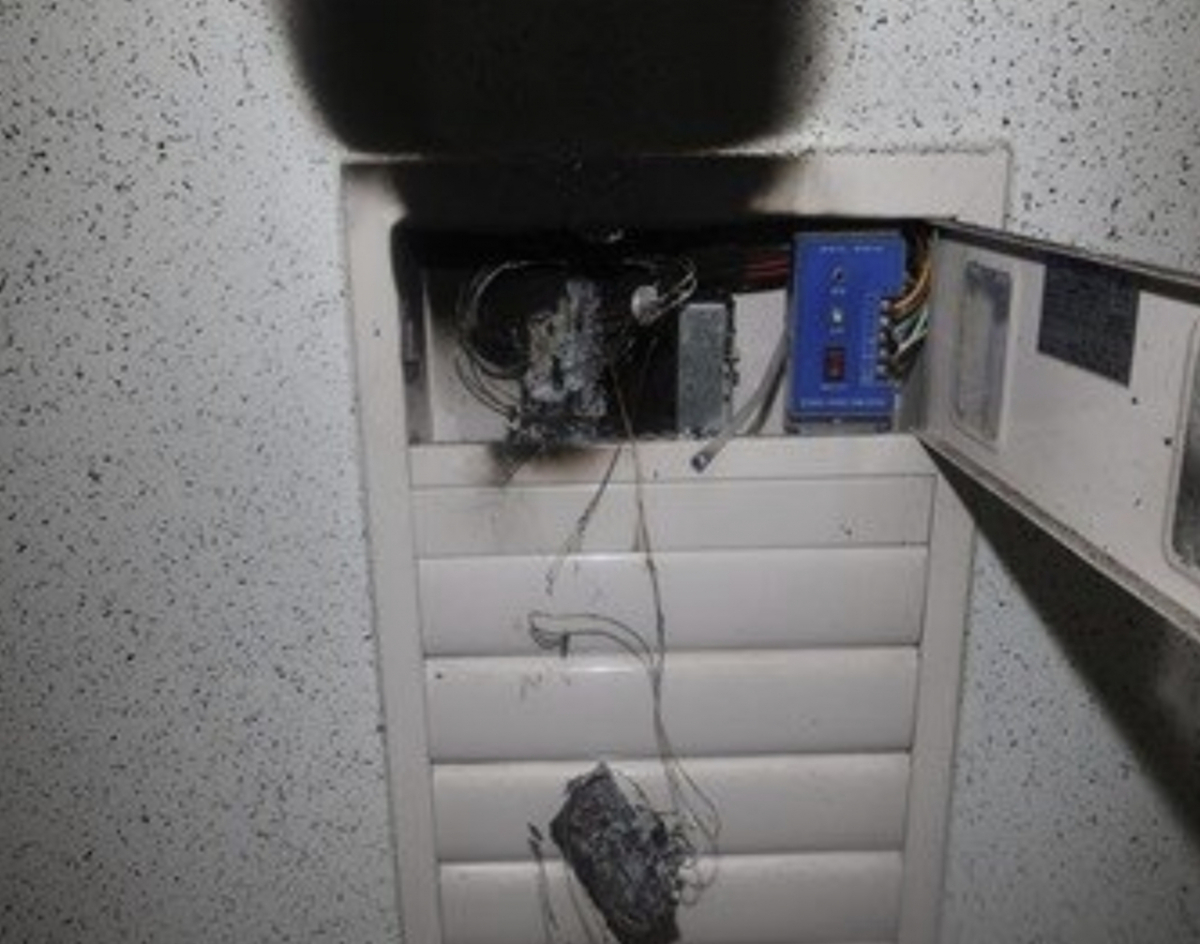 A씨의 방화로 회로기판 6개가 탔으며 각 층 부속실에 그을음이 생겨 소방서 추산 103만원의 피해가 발생했다.