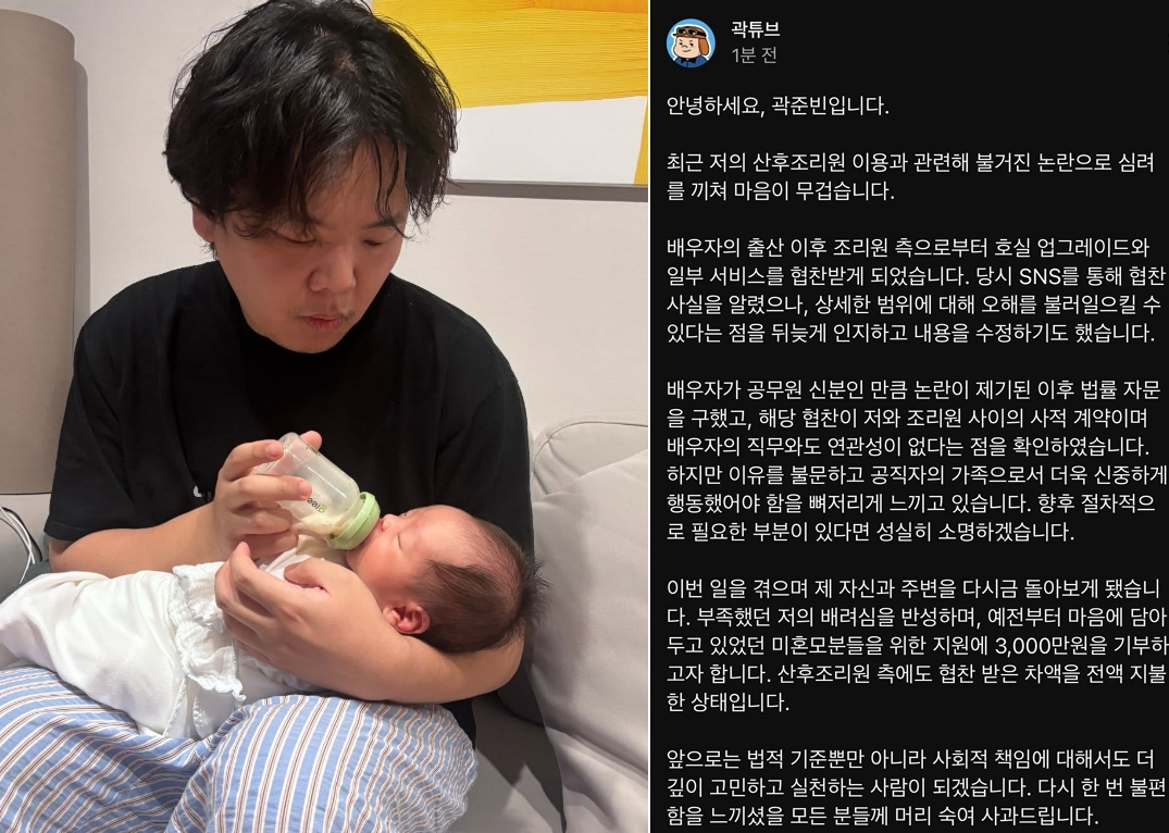 유튜버 곽튜브(34·본명 곽준빈)가 초고가 산후조리원을 협찬받은 사실을 공개했다가 공무원 아내가 청탁금지법(김영란법)을 위반한 것이 아니냐며 논란이 일자 사과문을 게재했다. 협찬 차액을 지불했으며 3000만원을 기부한다는 내용이다.