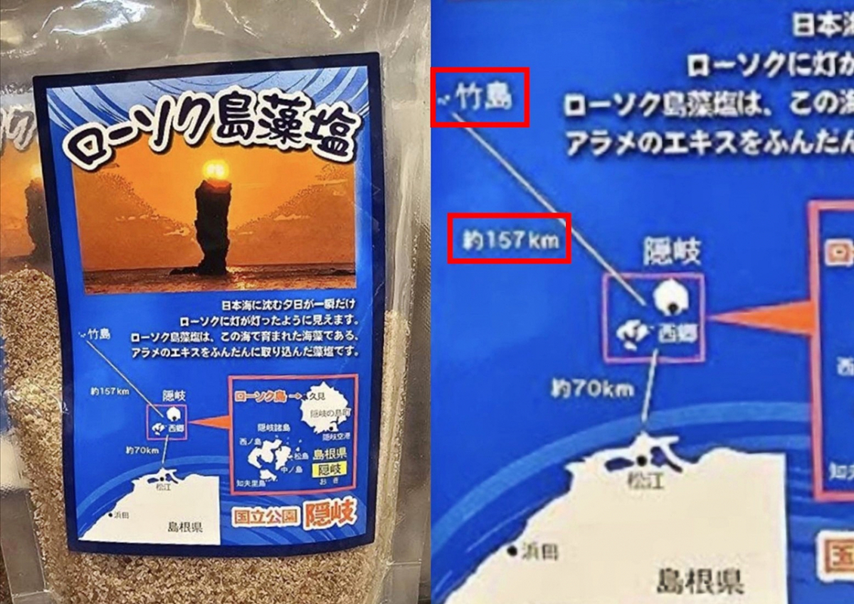 14일 서경덕 성신여대 교수는 한국인 관광객으로부터 제보받았다며 "해당 상점에서 시마네현 생산 소금을 판매하면서 겉면에 독도를 다케시마라고 표기하고 오키섬과의 거리를 157㎞로 소개했다"고 지적했다.