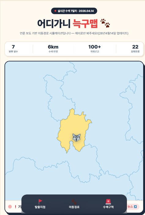 14일 온라인 커뮤니티를 중심으로 '어디가니 늑구맵' 웹사이트 링크가 퍼지고 있다. 언론 보도를 바탕으로 늑구의 위치를 실시간 추적하는 시뮬레이션 맵이다.