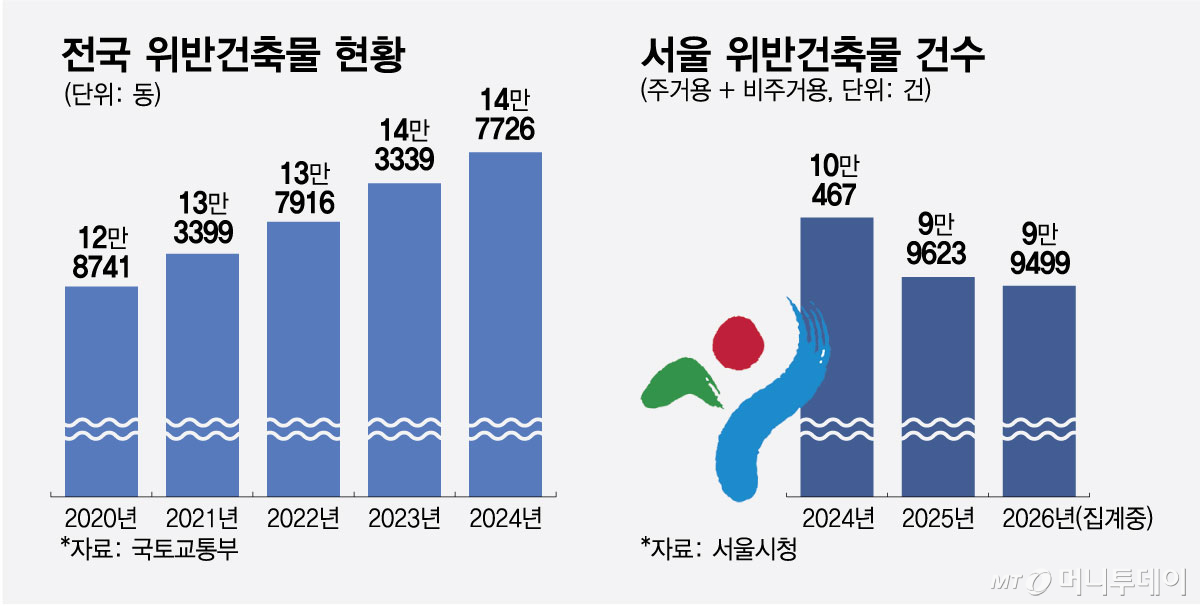16일 국토교통부에 따르면 2024년 12월 기준 전국 위반 건축물은 14만7726개동으로 집계됐다. 2020년 12만8741개동에서 △2021년 13만3399개동 △2022년 13만7916개동 △2023년 14만3339개동으로 매년 증가세다.