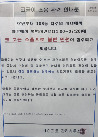 한 아파트에서 코골이로 인한 소음으로 민원이 접수되고 있다며 엘리베이터와 게시판에 공문을 붙여 온라인에서 화제다.