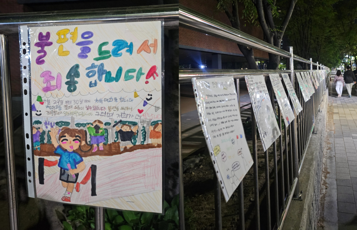 지난 19일 SNS(소셜미디어)엔 경기 성남시 분당구 한 초등학교 인근 담벼락에 학생들 손편지가 나란히 붙은 사진이 올라왔다.