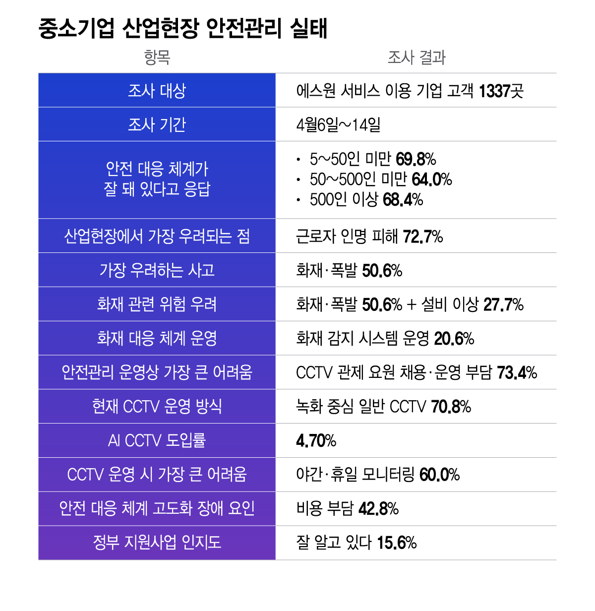 중대재해처벌법 적용대상이 5명 이상 사업장까지 확대된 지 2년여가 지났지만 중소기업 산업현장의 안전관리는 사후대응에 머무는 것으로 나타났다. 화재·폭발의 우려가 크지만 미리 감지하고 대응할 수 있는 체계도입은 여전히 부족했다.