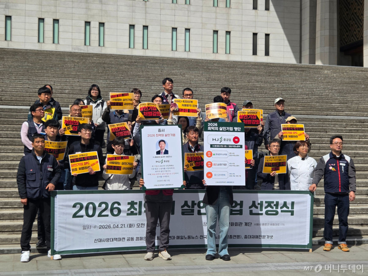 민주노총·노동건강연대 등은 21일 서울 종로구 세종문화회관 계단에서 '2026 최악의 살인기업 선정식'을 열고 이같이 밝혔다. 참가자들은 '산재는 살인이다. 기업을 처벌하라', '일하다 죽지 않게 기업을 처벌하라' 등의 구호를 외쳤다.