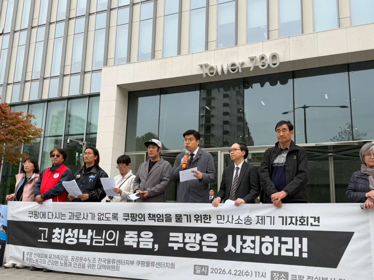 쿠팡 산재 피해 노동자 유가족 모임은 22일 오전 서울 송파구 쿠팡 본사 앞에서 기자회견을 열고 고(故) 최성낙씨 사망사건 관련 회사를 상대로 손해배상 소송을 제기한다고 밝혔다. 이들은 서울동부지법에 소장을 낼 예정이다.