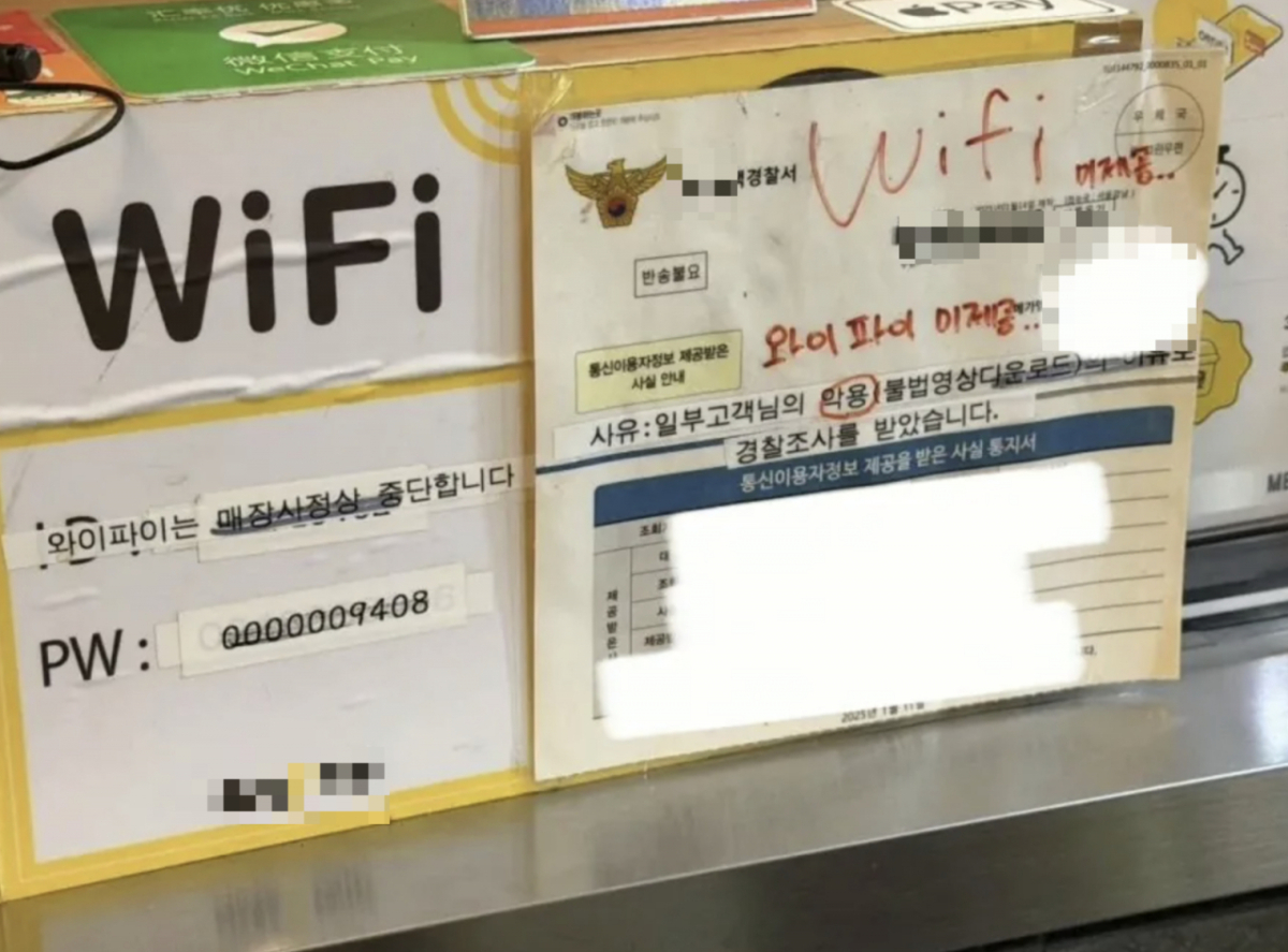사진 속 안내문에는 카페 측이 더 이상 와이파이를 제공하지 않겠다는 취지의 문구가 담겼다. 카페 측은 "와이파이는 매장 사정상 중단합니다"라며 "일부 고객님의 악용 이유로 경찰조사를 받았다"고 밝혔다.