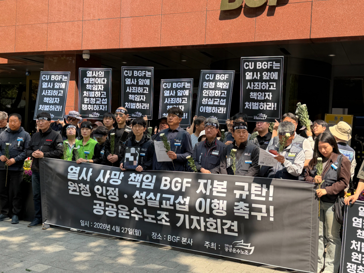 전국민주노동조합총연맹(민주노총) 공공운수노조는 27일 오전 서울 강남구 BGF리테일 본사 앞에서 기자회견을 열고 "(사건 이후) 일주일이 지났지만 BGF리테일·CU뿐 아니라 정부의 책임 있는 사과가 없었다"며 이같이 밝혔다.