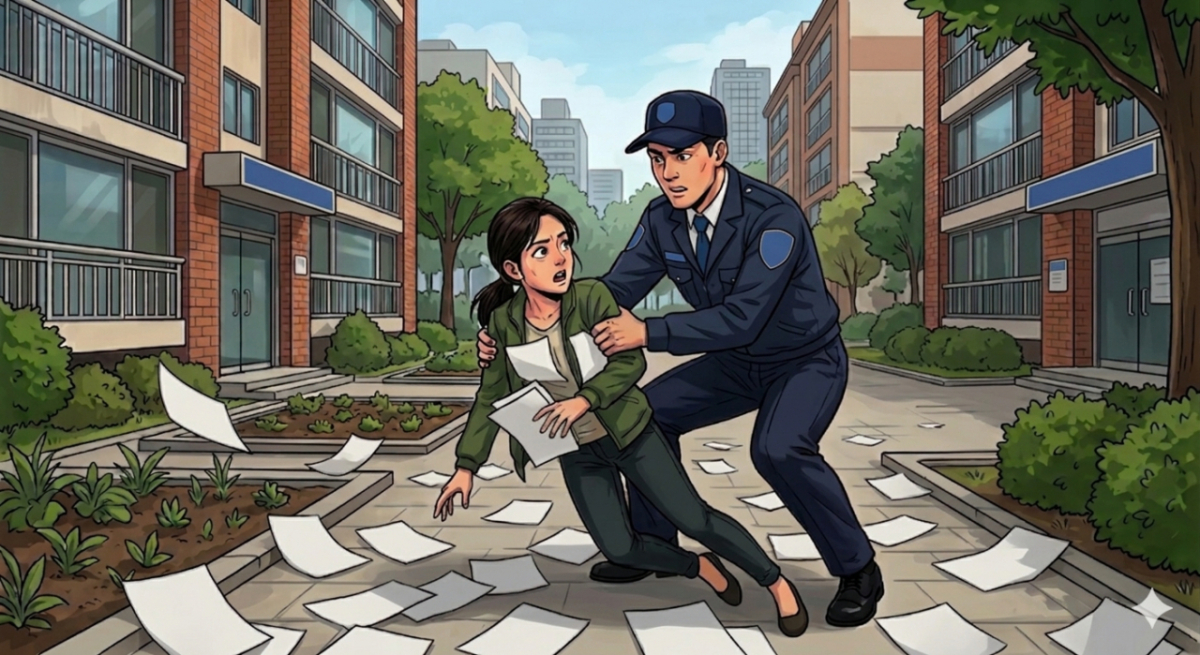 아파트 단지에 전단지를 붙이는 여성을 폭행한 30대 경비원이 정당방위를 인정받아 무죄를 선고받았다.