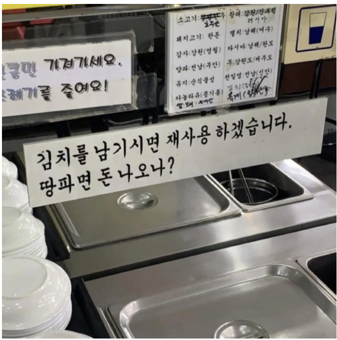 해당 사진에는 '김치를 남기시면 재사용하겠습니다. 땅 파면 돈 나오나?'라고 적혀있다.