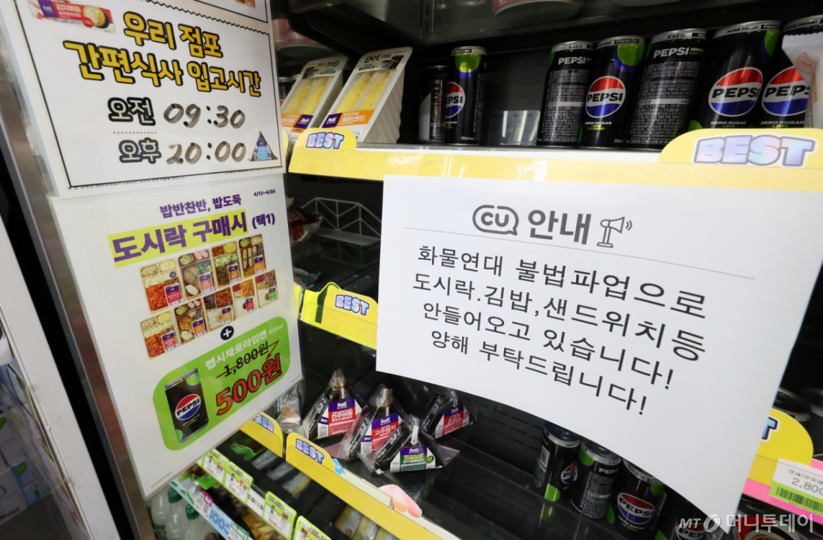 앞서 화물연대 CU 지회 소속 배송 기사들은 이달 7일부터 총파업에 돌입하고 일부 물류센터와 간편식 공장 등을 막아섰다. 물류 차질이 계속되자 CU 가맹점주들은 지난 16일 서울 여의도 국회 정문 앞에서 무릎을 꿇고 파업 중단을 호소했다.
