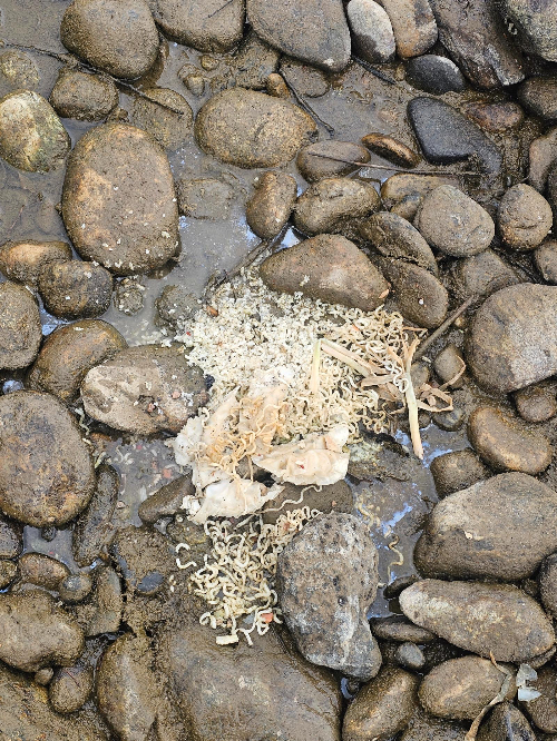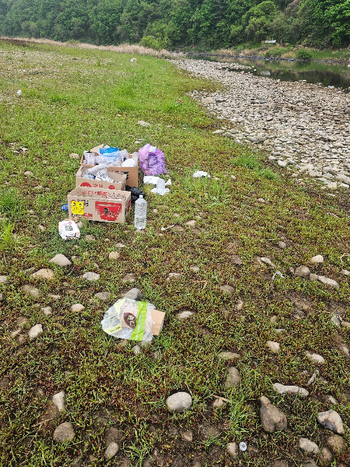 사진을 보면 쏟아진 라면·밥 등 음식물쓰레기와 일반쓰레기로 꽉 찬 일회용 쓰레기봉투, 패트병 등 재활용품이 든 라면 박스 등이 강가에 그대로 버려져 있다.
