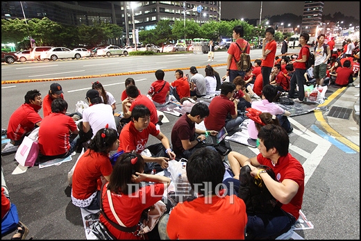 2010 남아공 월드컵 조별 리그 마지막 경기인 나이지리아전을 앞두고 22일 저녁 서울 강남 영동대로로 응원 나온 시민들이 이른 시간부터 거리에 자리를 잡고 있다.
