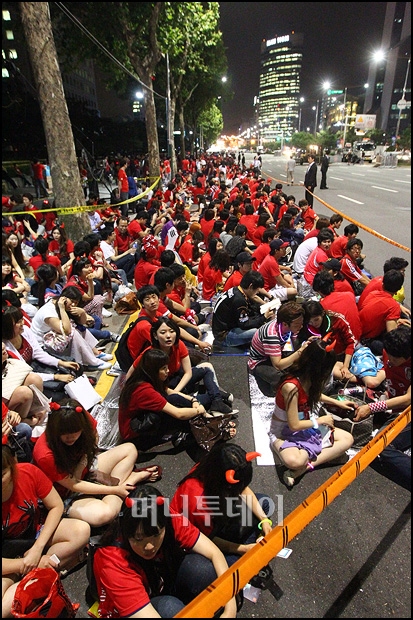 2010 남아공 월드컵 조별 리그 마지막 경기인 나이지리아전을 앞두고 22일 저녁 서울 강남 영동대로로 응원 나온 시민들이 이른 시간부터 거리에 자리를 잡고 있다.