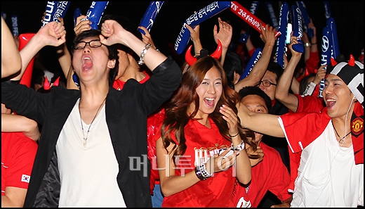 한국과 나이지리아가 16강행을 걸고 맞대결을 펼치고 있는 가운데 23일 새벽 서울 영동대로에서 응원중인 시민들이 이정수 선수의 동점골이 들어가자 환호하고 있다.