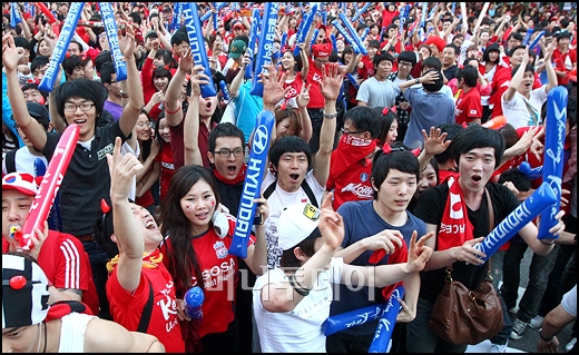 우리 축구국가대표팀이 남아공 월드컵 16강 진출이 결정된 23일 오전 서울 영동대로에서 거리응원을 나온 시민들이 환호하고 있다.