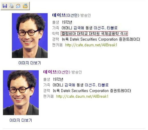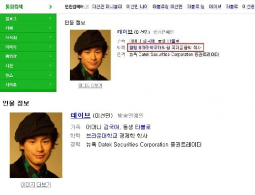 이에 반해 네이트는 여전히 데이브의 학력을 '컬럼비아대학원 국제금융학 석사'로 적고 있다.