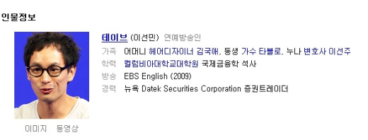 가수 타블로의 형이자 EBS '스타잉글리시' 진행자인 데이브(한국명 이선민, 38)의 학력정보가 연이어 수정되고 있다.