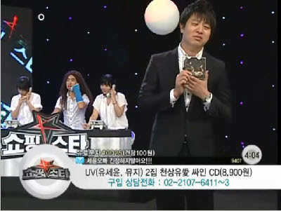 유세윤은 11일 새벽CJ오쇼핑(63,800원 ▲400 +0.63%)의 새 코너인 '쇼핑스타K'에 동료 개그맨 유상무·장동민 등과 출연, 자신의 그룹 UV의 새 음반을 직접 홍보하는 시간을 가졌다.