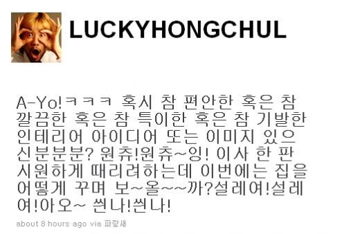 22일 새벽 노홍철은 자신의 트위터를 통해 "혹시 편안하거나 깔끔한, 혹은 특이하거나 기발한 인테리어 아이디어 또는 이미지 있으신 분? 이사 시원하게 가려고 하는데 이번에는 집을 어떻게 꾸며볼까 설레요! 신나!" 라는 글을 올렸다.
