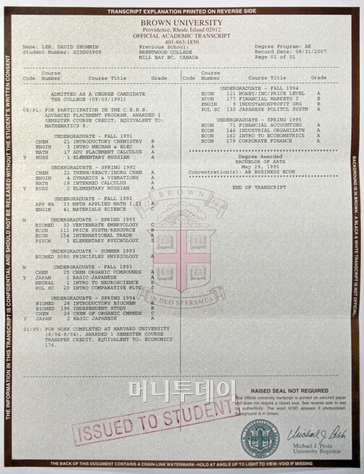 ▲지난 20일 머니투데이에 데이브가 제시한 브라운대학교 성적증명서, 1991년부터 1995년까지의 성적이 기록된 이 성적표에 이름은 David Seonmin Lee로 기재되어 있다