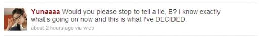 캐나다 토론토에서 전지훈련 중인 김연아는 25일 자신의 트위터에 “Would you please stop to tell a lie, B? I know exactly what‘s going on now and this is what I’ve DECIDED.(거짓말 그만하세요, B. 지금 어떻게 상황이 돌아가고 있는지 정확히 알고 있습니다. 이번 일은 내가 결정한 겁니다.)”라는 글을 올렸다. 여기서 ‘B’는 오서 코치를 뜻하는 것으로 보인다.