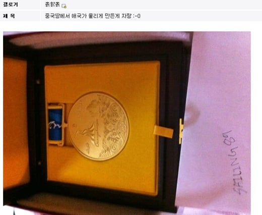 21일 오후 인터넷 커뮤니티 '디시인사이드'의 '자랑거리 갤러리'에 한 네티즌이 "중국 땅에서 애국가 울리게 만든 게 자랑"이라는 글을 남긴 것이다. 일명 '자랑갤'은 네티즌들이 스스로 자랑하고 싶은 것이 있을 때 '인증'과 함께 마음껏 자랑할 수 있는 인터넷 게시판이다.