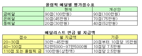 개정안은 올림픽 평가점수표에서 금메달은 그대로 유지하고 은메달은 70점, 동메달은 40점으로 각각 점수를 올려 연금액을 인상하는 것을 담고 있다.