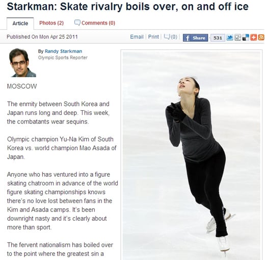 그는 기사 서두에 대한민국과 일본이 오랜 시간 깊은 적대관계에 놓여있다고 언급한 다음, 올림픽 챔피언 김연아와 월드 챔피언 아사다 마오를 ‘전투원(combatants)’에 비유하며 두 선수가 이번주에 대결한다고 했다.