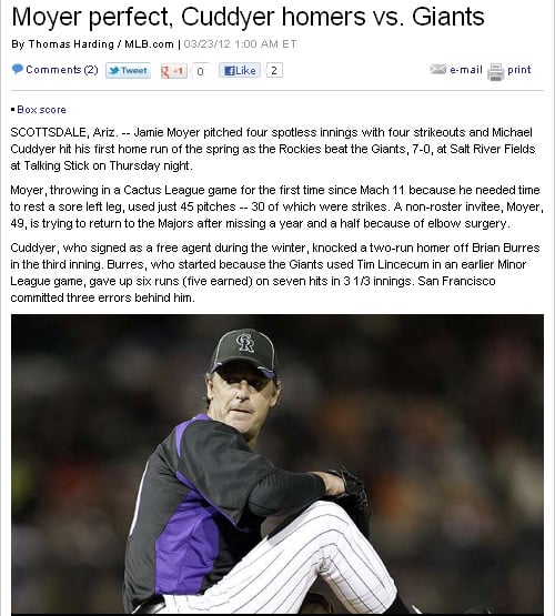 콜로라도 로키스의 좌완 투수 제이미 모이어가 솔트리버필드에서 열린 샌프란시스코와의 시범 경기에서 4이닝동안 퍼펙트 피칭을 선보여 찬사를 받았다. 모이어는 박찬호가 "40세 이후 닮고 싶은 선수"라고 언급했던 선수다. 필라델피아 필리스 시절 박찬호와 한솥밥을 먹으며 박찬호에게 컷패스트볼을 전수해 국내에도 잘 알려져 있다.