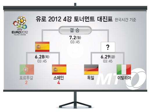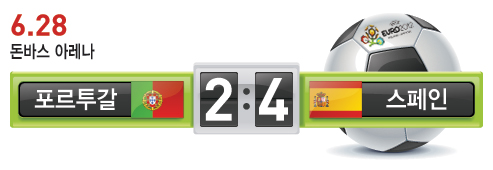 스페인이 28일 새벽 3시 45분(한국시간) 우크라이나 도네츠크 돈바스 아레나에서 열린 유로 2012 4강전 포르투갈과의 경기에서 전,후반 연장전 120분을 모두 득점없이 0-0으로 비긴 뒤 승부차기에서 4-2로 꺾고 결승에 진출했다. 이로써 스페인은 유로 2008, 2010 남아공월드컵에 이어 3연속 메이저대회 우승을 노릴 수 있는 발판을 마련했다.