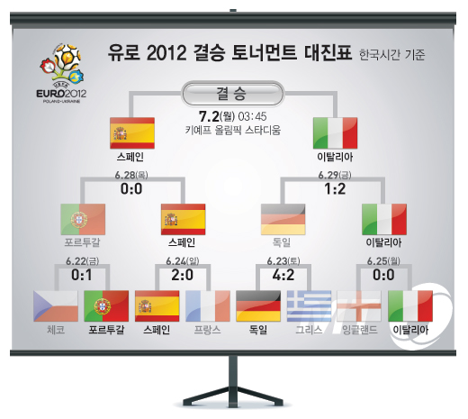 결국 이탈리아가 독일을 2-1로 물리치고 유로 2012 결승전에 진출했다. 이로써 이탈리아는 '무적함대' 스페인과 앙리 들로네 컵을 놓고 한판 승부를 펼치게 됐다. 대망의 결승전은 오는 7월 2일 새벽 3시 45분(한국시간) 우크라이나 키예프 올림픽 스타디움에서 열린다.